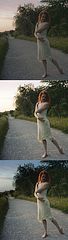 To the right, I'm showing three stages of editing. The version on top preserves the entire captured dynamic range mapped fairly linearly. The version in the middle makes the skin tones be about where they should be with higher contrast, but you can see how the skies are totally blown out. The version on the bottom has the sky dodged, so that it isn't blown out, but still keeps the woman at the sort of contrast level you'd expect.