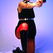 Blue light, mirrored dress, red fishnets, and a red gun