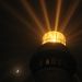 Beams of light coming from the Pigeon Point Lighthouse at night, with the moon in view.